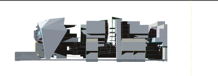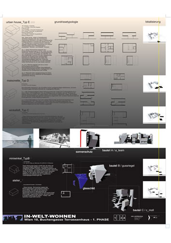Das Terrassenhaus als urbane Siedlungsstruktur wird zur Mikrostruktur des übergeordneten urbanen Gefüges `Stadt´. Durch ein Anreichern der `Monokultur´ Wohnbau mit allgemeinen Funktionen wird das Siedlungsgefüge zu einer be- und erlebbaren städtischen Umwelt. Die durchlässige Erdgeschoßzone zieht ein Wegesystem nach sich, das im Inneren des Terrassenhauses in den verschiedenen Baukörpern über Laubengangsysteme in die Höhe gehoben wird - Gemeinschaftseinrichtungen wie Terrassen und Schwimmbad auf der Dachebene bilden an verschiedenen Stellen attraktive Zielpunkte dieser halböffentlichen Erschließungssysteme.