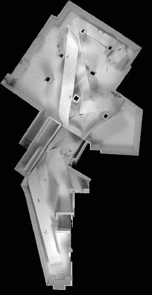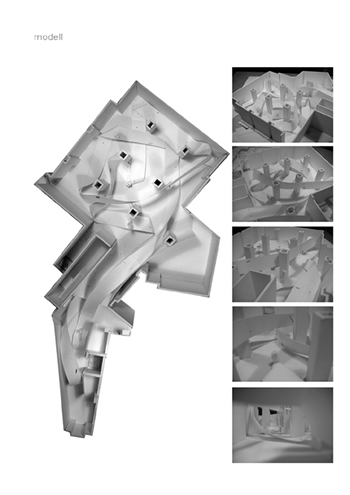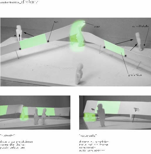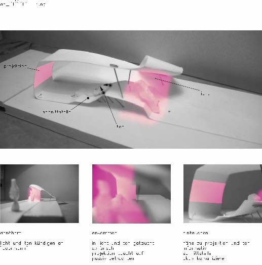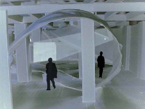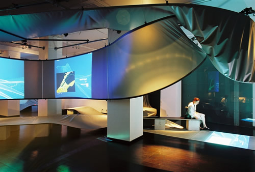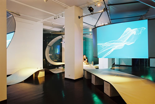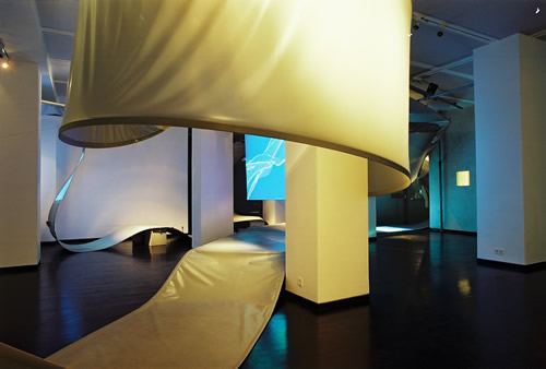 In the virtual exhibition SMART ENVIRONMENT the visitor becomes familiarised with the theme of design processes and digital aesthetics of intelligent products without the direct meeting with the classical object . He visits the conventional presentation area, but only to find through that space a purely virtually prepared exhibition. The architectural space appears firstly in its original, mediating function decoupled. The virtual information architecture transfers the task of a spatially differentiated presentation surface, through which one gets referred to the high complexity of today's production conditions in product Design and fashion. The requirement of ESCAPE*spHERE deals with strategies of a contentwise feedback - the architectural space develops into a three-dimensional interface. It offers the visitor an accessible landscape and introduces parameters of physical distance and proximity conveying the transfer of knowledge. The exhibition visitor meets in the existing exhibition space a spatially curved ribbon structure, which constitutes a three-dimensional guiding system and which mediates gradually between reserved, collective, more intimate and individual information processing.